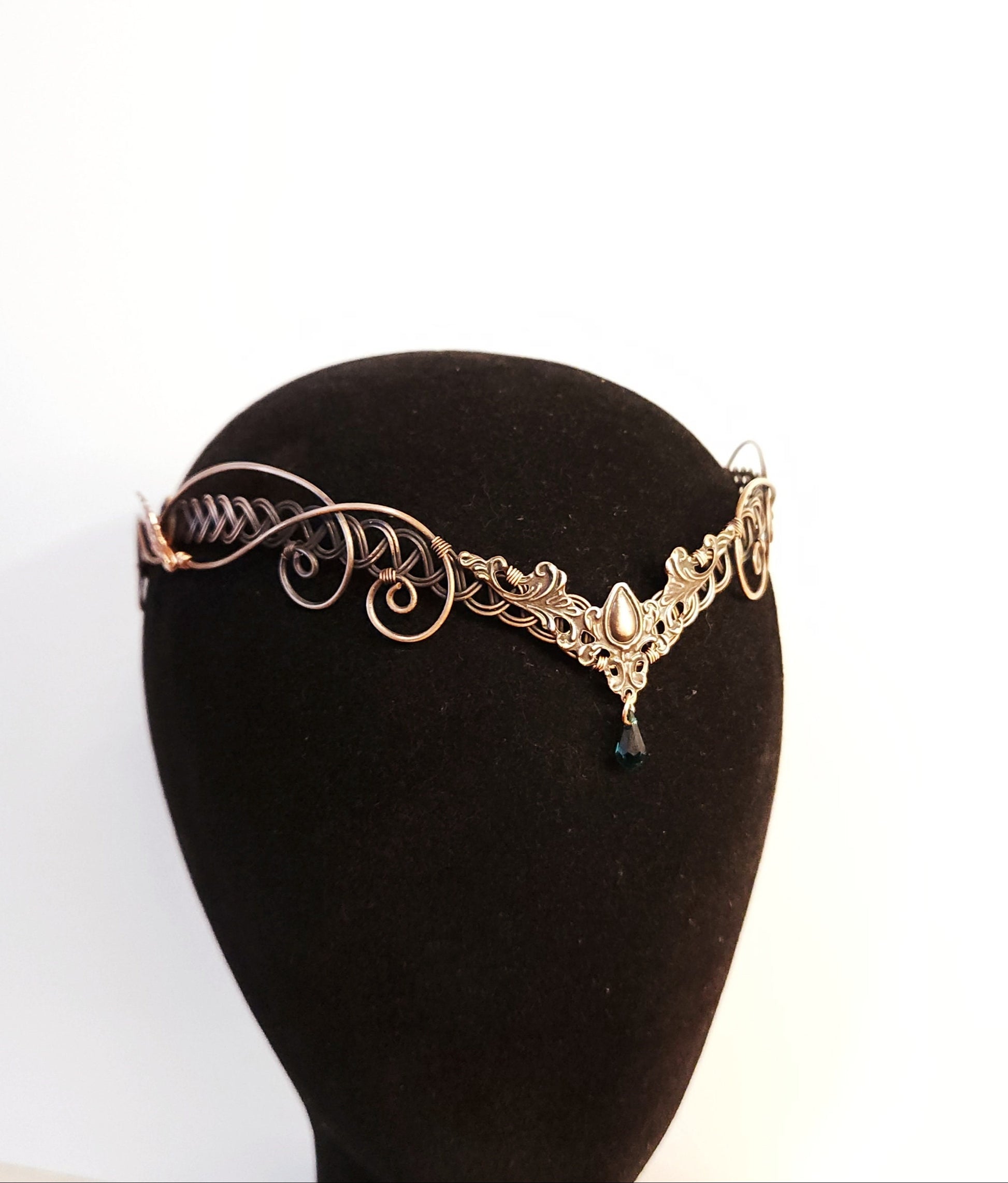 Bare copper metal wire handcrafted celtic headpiece that is made adjustable with an extender chain and clasp to allow it to fit any head size.