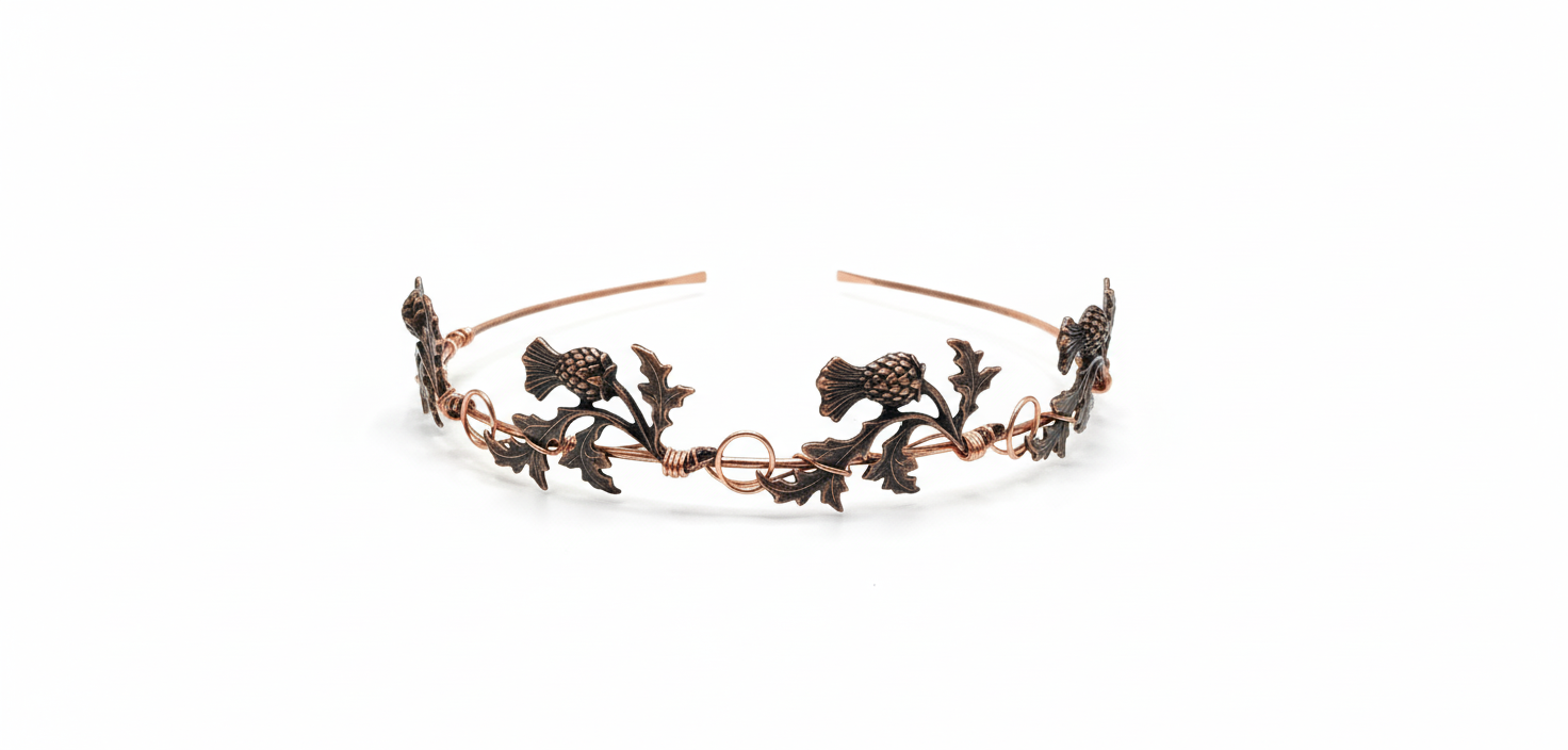 Celebrate Scottish heritage and nature's rugged beauty with this stunning, handmade copper thistle headband. Meticulously sculpted, each piece captures the intricate detail of Scotland’s national flower, transforming a simple accessory into a wearable work of art.