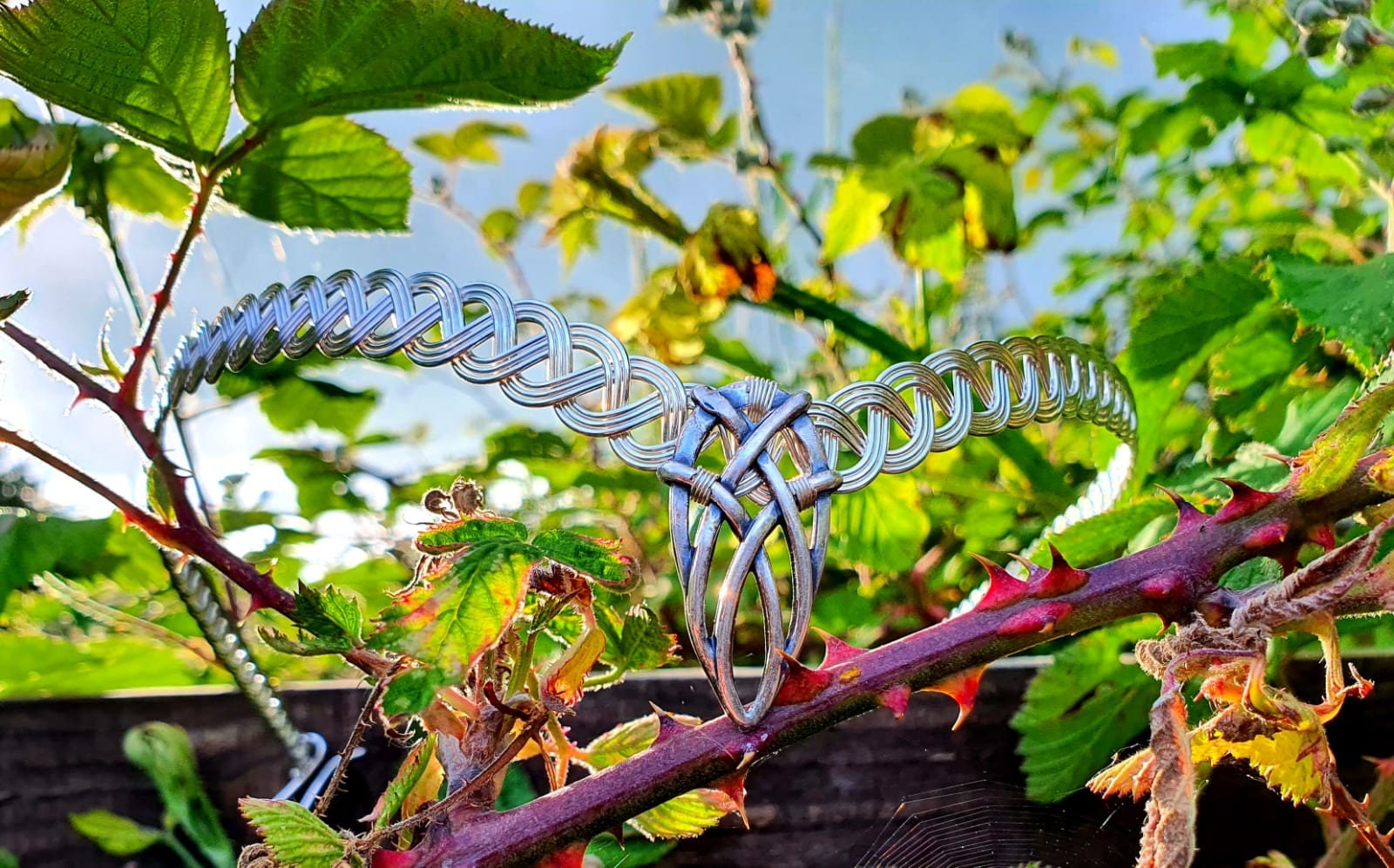 It is made from a silver plated wire with an antiqued silver plated Celtic setting to the front.
