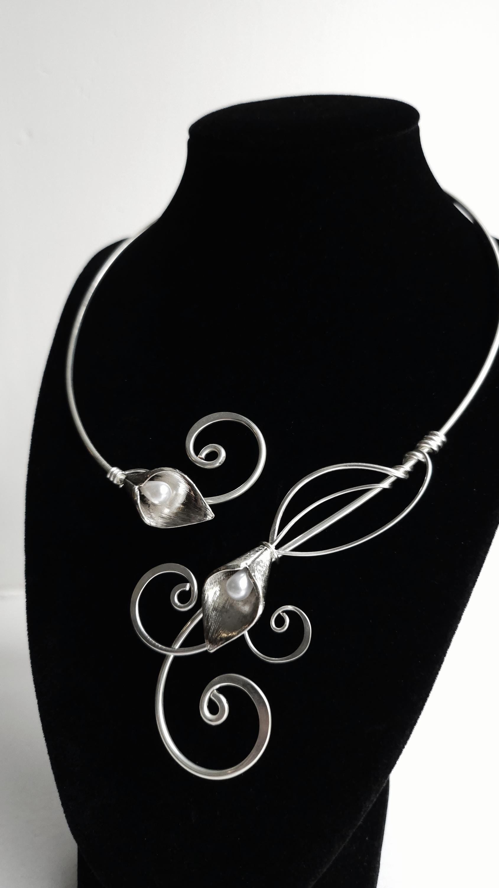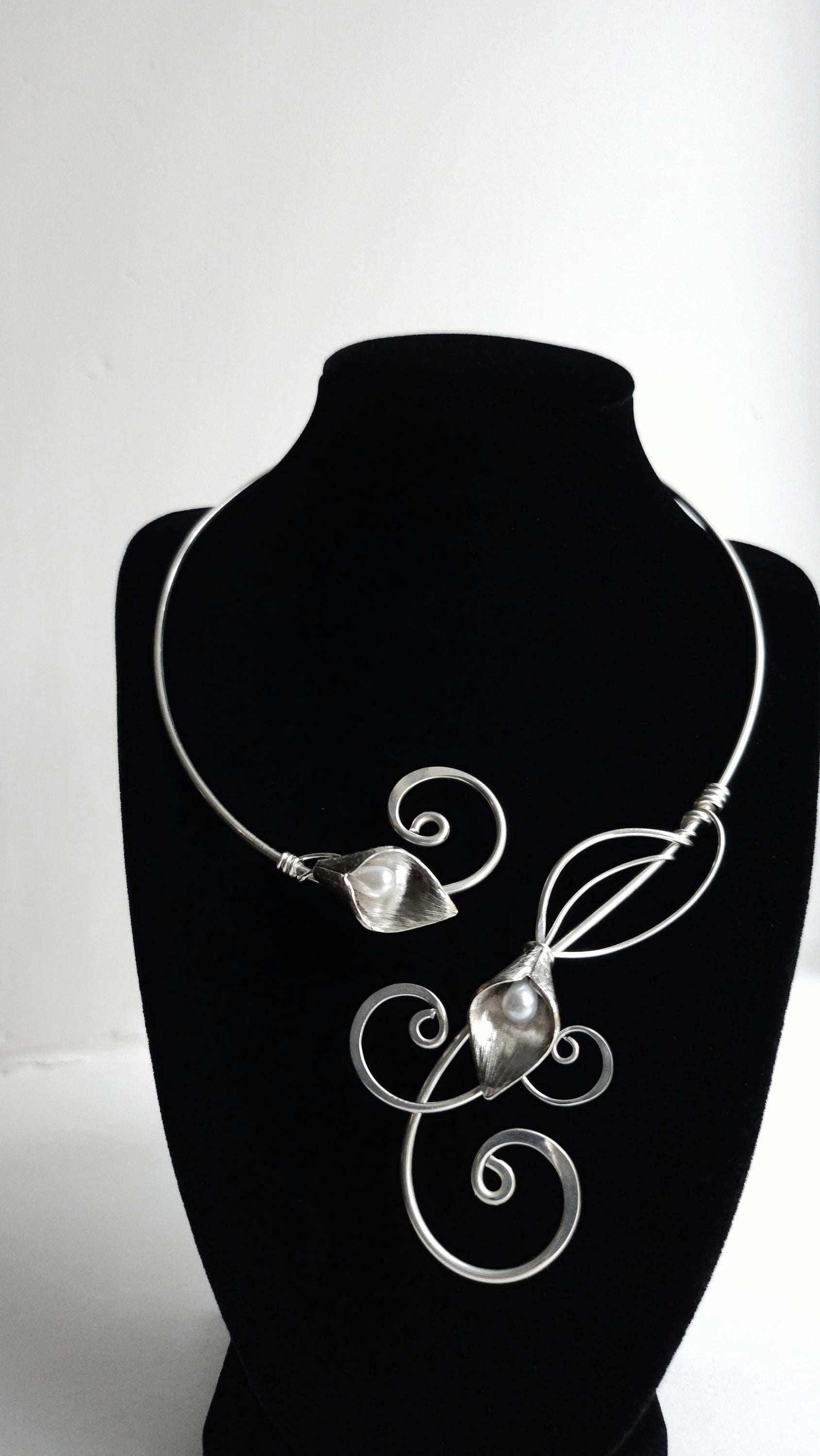 handmade elven torc collar necklace. Crafted from sterling plated copper, this unique piece features hammered curls that elegantly frame your neck. Each of the two silver lily accents holds a delicate faux pearl at its center, adding a touch of timeless grace.