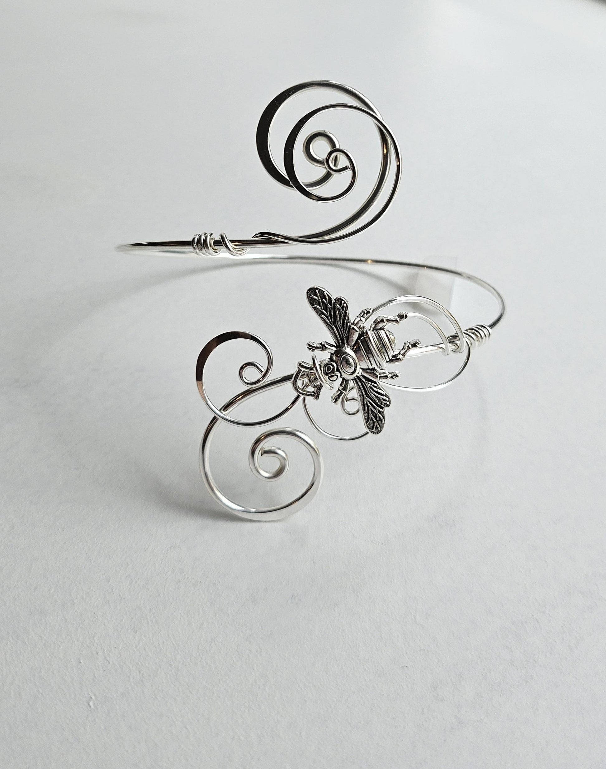 This handmade arm cuff features a distinctive bee motif on the front, offering a unique addition to your collection. The cuff is designed with hammered curls intricately woven together.